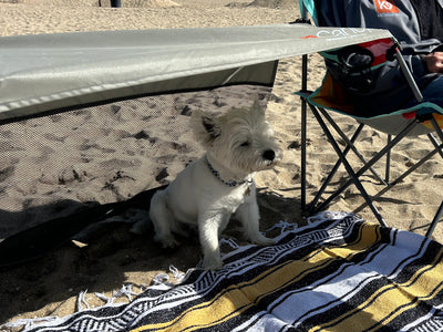 We've designed the K9Canopy™ so it can be fixed between any 2 objects - like beach chairs, carts or trolleys - with simple bungee cords. The mesh back provides airflow and visibility for your pet, and there is a sand pocket and tent pegs to secure the back if needed