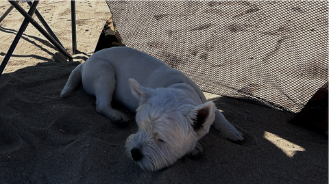 K9Canopy is a portable shade that fits between beach chairs, giving dogs a safe, cool, and comfortable space to relax outdoors.